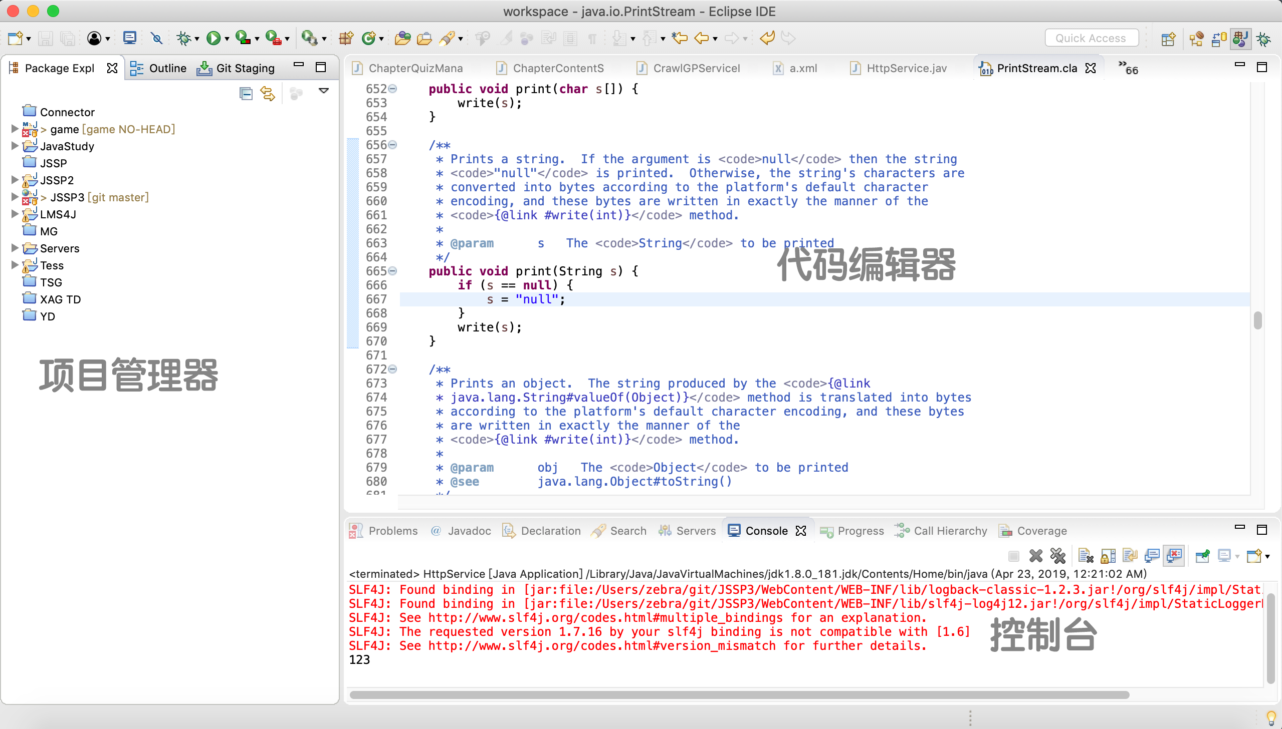 如图所示,eclipse左边的区域是项目管理器(Package Explorer),建立的项目都会在这里出现。右边是代码区,除了java文件,html、css、JavaScript、xml各种格式的文件,都有对应的文件编辑器。