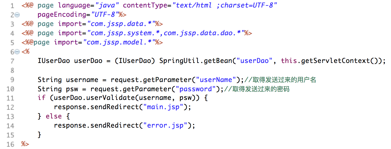 这个登陆页面的数据将发送到validateLogin.jsp(上图form的action属性),validateLogin.jsp代码如下: